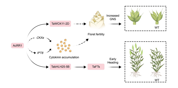 科研團隊鑒定到一個冰草穗發育的關鍵基因AcRR1。在小麥中異源表達該基因可顯著增加植株穗粒數,同時對粒重等農藝性狀沒有任何影響。田間試驗顯示,相對于對照品種,表達該基因后的小麥產量可提升9.7%-12.3%。進一步研究發現,該基因通過調控小麥小花育性、開花相關基因的表達和幼穗細胞分裂素積累來提高穗粒數、縮短其春化周期、促進早抽穗,進而提高小麥產量和早熟。該研究為通過導入外源基因來提高小麥產量提供了理論基礎和新思路。