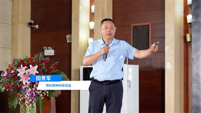 偉科育種科研總監田貴軍老師在發言中指出,偉科育種與商都種業長期緊密合作,成功推出了偉科812、偉科939、偉科2109、偉玉178等一系列品種,為商都種業發展注入了強勁動力。針對黃淮海地區氣候變化與種植模式的改變,偉科育種團隊對偉科812進行持續聚優改良,使其綜合抗性、豐產性顯著提升,穗行數增加,果穗變大。同時,團隊以偉科核心種質為基礎,融入溫熱種質,優化抗病性、抗倒性、耐密性等性狀,測配數萬組合,嚴格篩選,成功培育出高產、優質、多抗、耐密的紅軸中大穗型玉米新品種偉科2109,同時實現了品質的突破性提高。未來,偉科育種將深化與商都種業的合作,圍繞市場需求,培育更多突破性優良品種,助力商都種業在市場競爭中占據優勢地位。