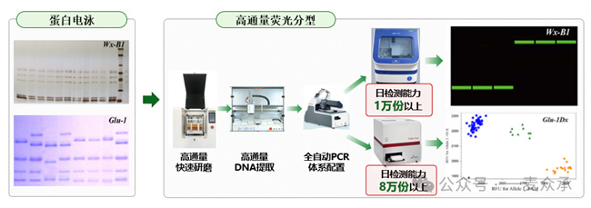 強筋小麥主要用作烘烤類食品,其加工品質主要由面筋蛋白組分及其含量決定,特別是麥谷蛋白(由高低分子量麥谷蛋白亞基組成)起著重要作用。目前強筋小麥育種主要以優異高分子谷蛋白亞基Dx5+Dy10的選擇為核心。本團隊通過構建面筋蛋白組分檢測平臺,發現不僅麥谷蛋白亞基組成起作用,其含量對加工品質也至關重要,因而在優異亞基組成的基礎上提高其含量,是進一步提升品質的有效手段。由此提出了以“優質亞基+含量”選擇為核心的優質育種新策略;同時本團隊還開發并優化了針對谷蛋白亞基主選基因的檢測技術,如研發出Glu-B1位點5個Y類型高分子量麥谷蛋白亞基特異分子標記,并實現從蛋白電泳到DNA高通量熒光分型的技術升級,日檢測能力提升至8萬份以上,具備全自動、高通量特點;此外,還創建了基于面筋聚集儀特性的快速評價強筋小麥品質的方法,可實現面團流變學特性的早代選擇。