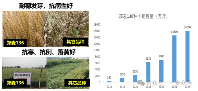 中筋小麥主要用作蒸煮類食品,其加工品質除受蛋白(面筋)質量影響外,淀粉品質也起到重要作用。目前本團隊已挖掘出上百個與蒸煮品質相關位點,開發出12個與蒸煮品質性狀相關的分子標記,為優質中筋小麥育種提供了重要基因選擇手段。育成的代表性品種鄭麥136,多年多點大面積生產示范平均畝產達800公斤以上,且具抗寒、抗倒、高抗條銹病等特性,先后通過河南省、國家、湖北省審定,在近年多種自然災害考驗中表現卓越,成功抵御了倒春寒、銹病、穗發芽、罕見高溫與持續干旱等多重挑戰,展現出超強的環境適應性和穩產能力,授權企業延津帝益麥公司已連續兩年種子銷量突破1億斤,位居我國種企麥種銷量前列。最近,該品種已成功入選國家農作物品種推廣目錄“成長型品種”首位,并被農業農村部推介為“2025年農業主導品種”,種植面積位居河南省主導小麥品種第二位。