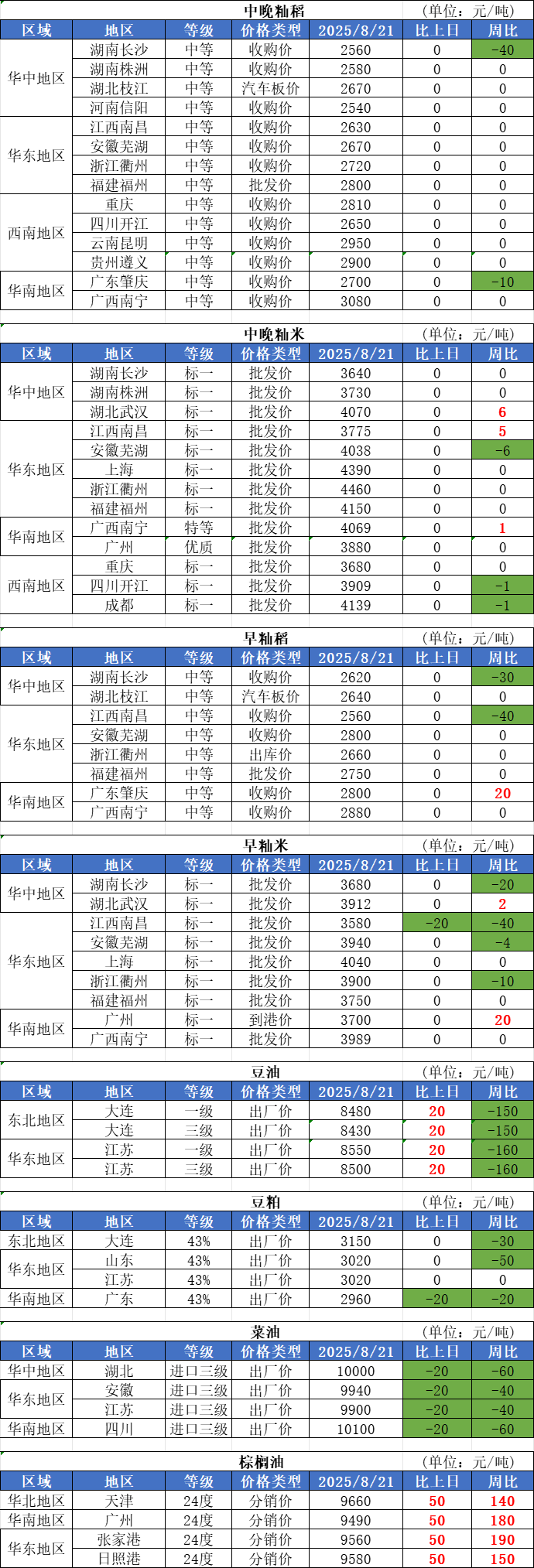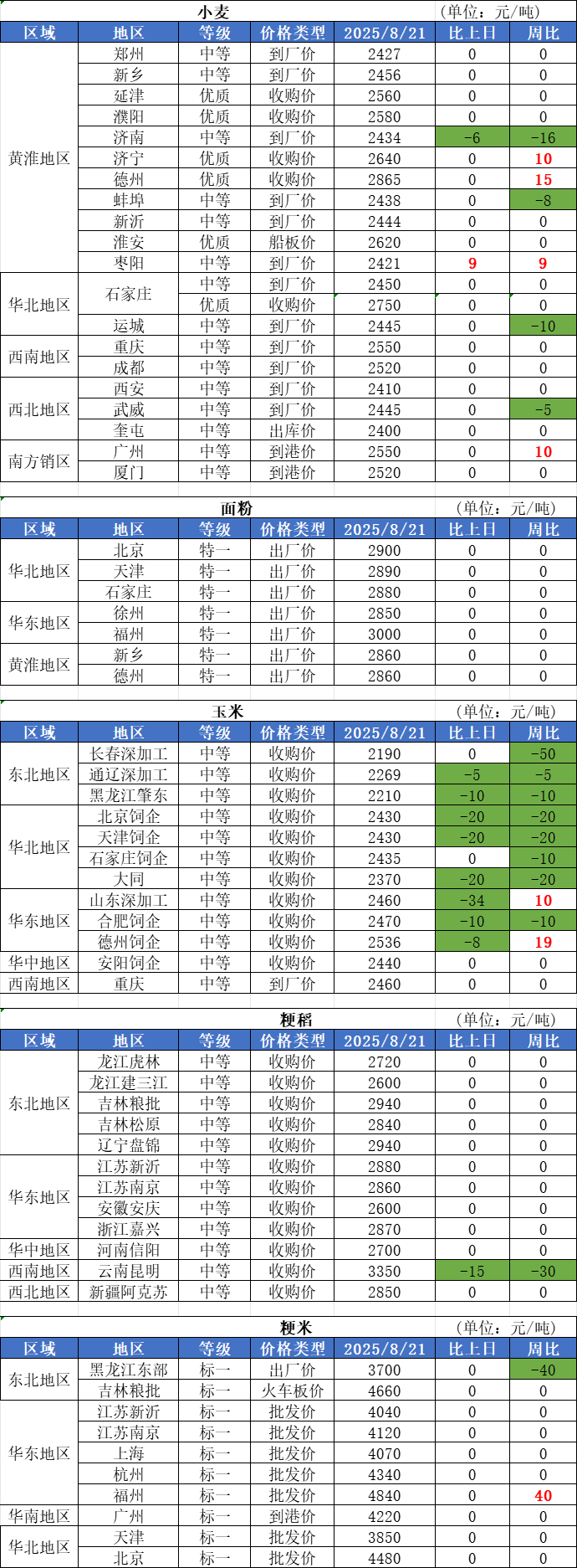 1、8月21日,小麥市場價格繼續弱勢下跌,調整范圍多在5厘以內,落價企業多數集中在山東、安徽。目前小麥雖有五大主產區托市收購兜底,但新麥上市充裕,疊加玉米價格下跌,行情難有突破。