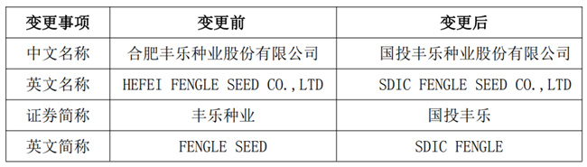 合肥豐樂種業股份有限公司(以下簡稱“公司”)中文名稱由“合肥豐樂種業股份有限公司”變更為“國投豐樂種業股份有限公司”,英文名稱由“HEFEI FENGLE SEED CO.,LTD”變更為“SDIC FENGLE SEED CO.,LTD”;