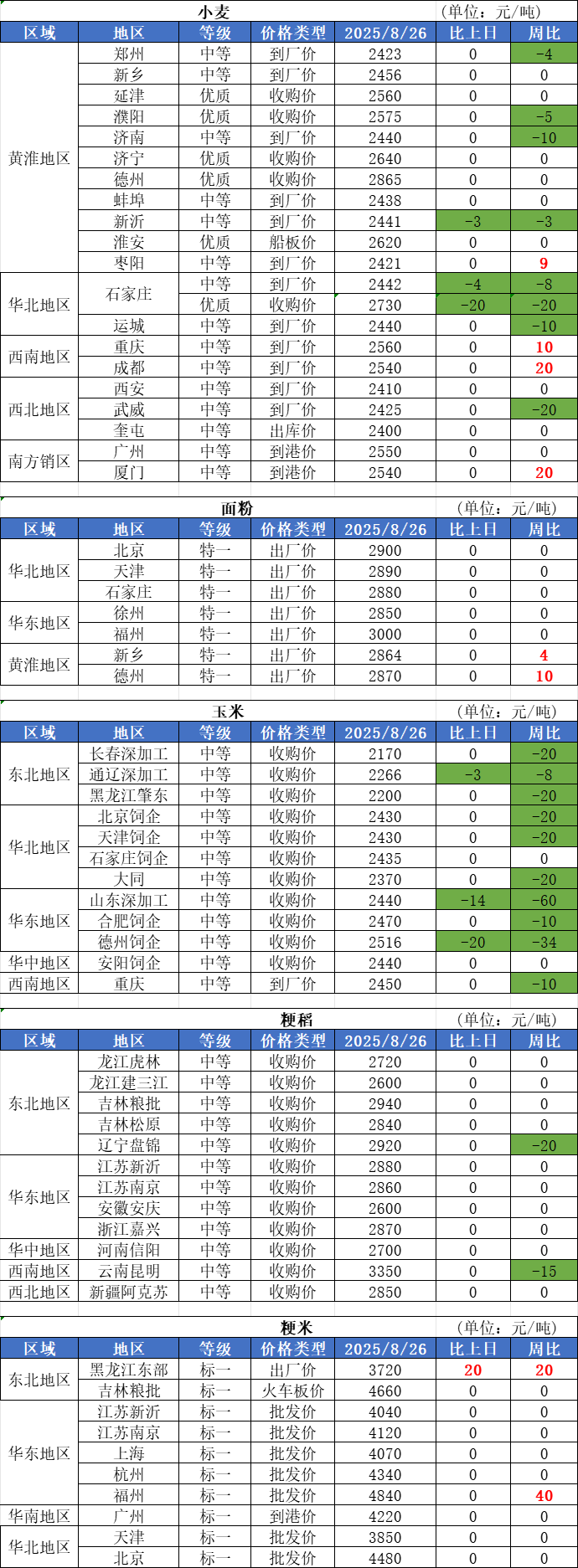 1、8月26日,小麥市場價格漲跌互現,山東、河北有企業不同幅度落價,河南部分面企小幅漲價,調整幅度在2-4厘。當前托市收購工作仍在穩步推進,截至目前,累計收購量約1000萬噸,政策性收購對穩定小麥市場價格發揮了積極作用。