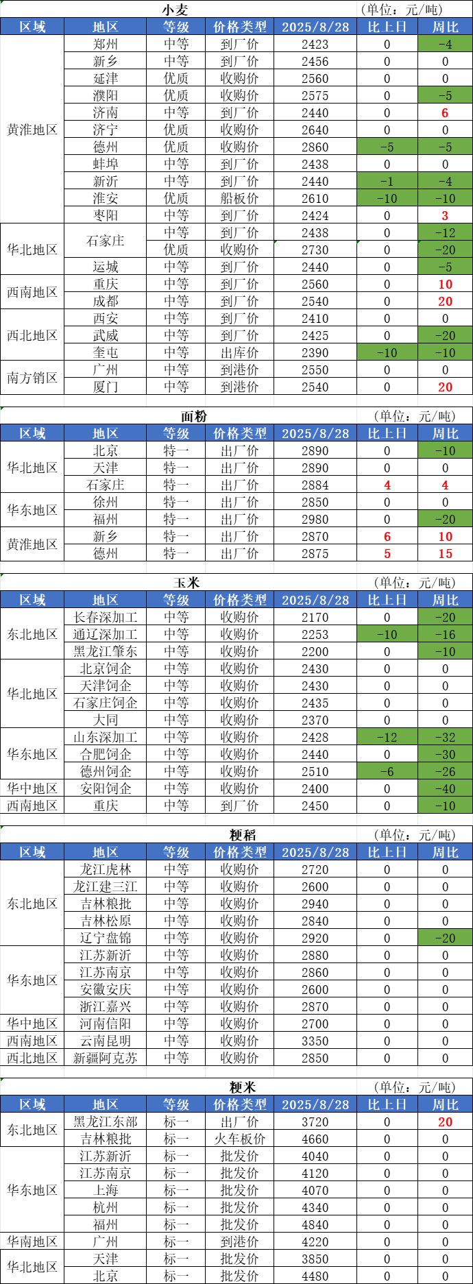 1、8月28日,主產區小麥價格穩中局部下調,下調區域主要集中在山東,幅度為2-3厘。由于下游面粉消費緩慢改善,山東、河南、河北零星粉廠上調面粉價格10元/噸左右,但整體小麥還處于供大于需的格局,新玉米上市也拖累麥價。