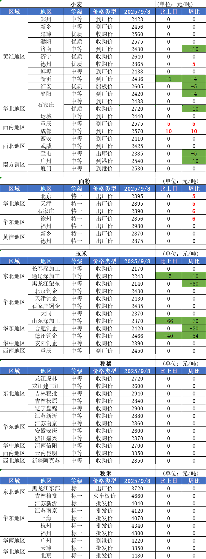 1、9月8日,小麥加工企業收(shou)購價格小(xiao)范圍下跌,落價區域集中在山東(dong)、河(he)北、安徽、陜西(xi)等(deng)地,幅度(du)在5厘以內。截(jie)至(zhi)目前,托市收(shou)購庫點已經累計超過(guo)520家,市場(chang)預估9月底全國小(xiao)麥(mai)托市收(shou)購量(liang)可能(neng)達1500萬噸左右(you)。