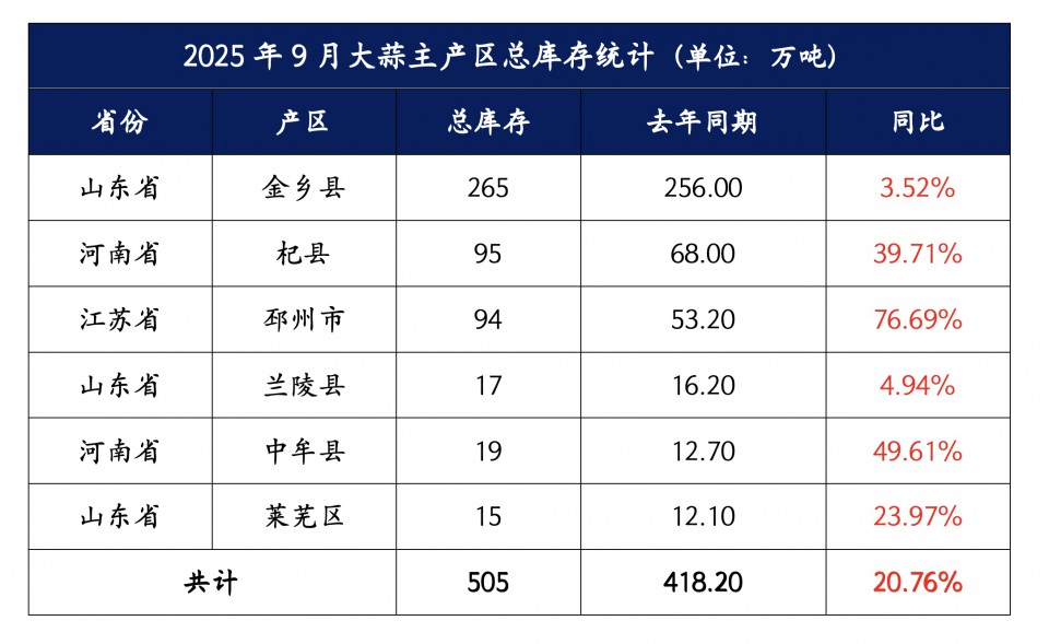 庫存情況。供應量,2025年山東省42個主產縣的大蒜收獲面積為264.36萬畝,產量為330萬噸左右。庫存量,2025年9月1日大蒜主產區庫存量為510萬噸左右。其中,山東省庫存量為305萬噸左右(金鄉產區273萬噸左右、蘭陵產區17萬噸左右、萊蕪產區15萬噸左右)。