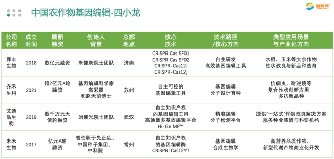 舜豐生物、齊禾生科、艾迪晶生物、未米生物等“四小龍”快速崛起,這幾家企業聚焦于作物育種和生物技術研發,依托自主可控的基因編輯工具體系,不僅在關鍵技術環節實現了突破,還在市場應用端展現出強勁潛力。