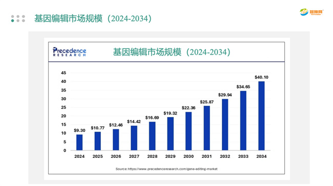 2022年被譽為“中國生物育種元年”,政策與資本雙雙加碼生物育種賽道。據統計,2024年全球基因編輯市場規模已達93億美元,預計將從2025年的107.7億美元增長至2034年的401億美元,期間復合年增長率高達15.74%。