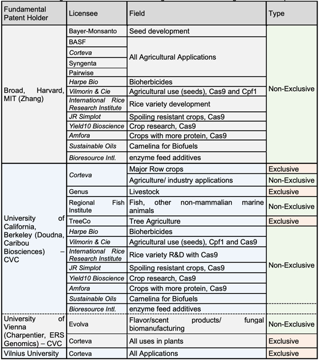 從專利格局看,科迪華(Corteva)憑借從 Broad、加州大學伯克利分校(CVC)、維也納大學、維爾紐斯大學等處獲得的大宗作物及植物全應用的獨占許可,再加上廣泛的非獨占授權,已在農業基因編輯領域構筑起強大的專利壁壘,掌握著全球產業競爭的主導權。相比之下,拜耳-孟山都、先正達、巴斯夫等巨頭則更多聚焦特定作物或應用場景,而 Vilmorin、國際水稻研究所、JR Simplot 等機構則深耕特色作物與性狀改良。