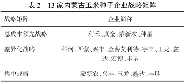 蒙新農、興豐、玉龍、鑫達、豐墾5家企業適合采用集中化戰略。蒙新農錨定黑龍江早熟玉米種子需求開展精準育種,努力篩選抗低溫特性強的種質資源,選育能克服黑龍江每年春季播種后低溫冷害的品種,采取的是專攻特定區域的競爭戰略。興豐則專注極早熟玉米種植區,其研發目標是不斷推出適宜低積溫區域種植的玉米品種。由于中早熟玉米種植區具有分散的特點,玉龍和鑫達可采取集中戰略滿足這部分市場需求。