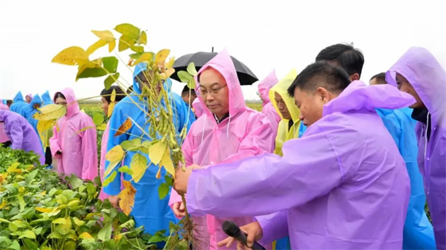 會前,參會嘉賓冒雨走進田間,實地觀摩了集中展示的大豆新品種,見證了科研成果在生產實踐中的落地應用。