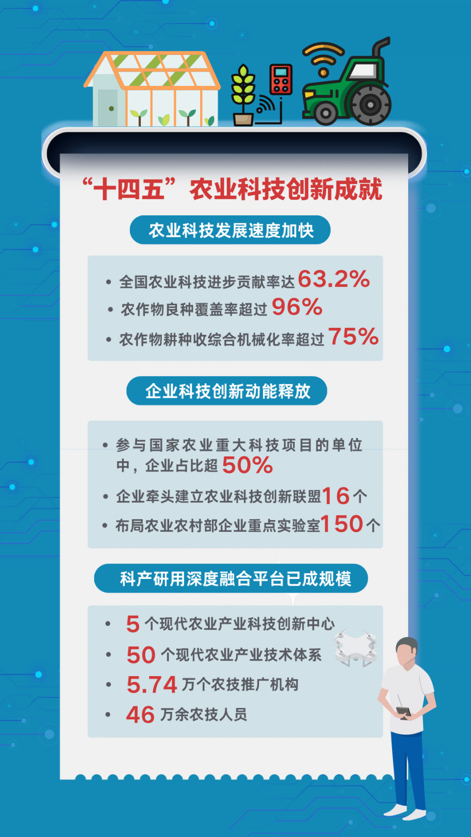 “十四五”期間,我國農業科技產學研用深度融合的格局加速形成。在參與國家農業重大科技項目的單位中,企業占比已超過一半;農業農村部從部屬“三院”遴選45名科技副總奔赴企業一線開展服務;支持企業牽頭成立水稻商業化分子育種等16個農業科技創新聯盟,通過實體化運行帶動行業技術進步;打造50個現代農業產業技術體系,為近200種農產品提供全產業鏈科技支撐和全天候技術服務;面向160個國家鄉村振興重點幫扶縣,組織專家開展“組團式”幫扶;累計推廣新技術5000多項,培訓各類人員1880余萬人次,提供應急救災等技術性服務2.47萬余次。
