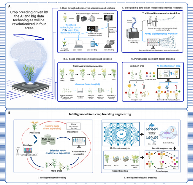 革命性作物育種:下一代人工智能和大數據驅動的智能設計育種時代 (a) 由下一代人工智能和大數據技術驅動的作物育種將在四個領域發生變革:(i) 高通量表型獲取與分析;(ii) 生物大數據驅動的作物功能基因組學研究;(iii) 基于人工智能的育種組合與選擇;(iv) 個性化智能設計育種。 (b) 未來,生物技術與信息技術(BT + IT)的深度融合將推動智能驅動的作物育種工程發展,并具有兩個關鍵特征:(i) 基于大數據和育種模型的智能雜交育種;(ii) 利用人工智能和合成進化技術的智能生物育種。(來源:趙春江院士團隊)