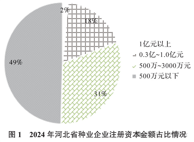 “十四五”期間,河北省種業取得長足發展,企業數量逐年穩步增加(表1)。截至2024年底,河北省持有效經營許可證的種業企業696家,比“十三五”攻堅之年(2019年的403家)增加293家,增幅72.7%。其中,部級發證種業企業26家、省級發證種業企業145家、市級發證種業企業79家、縣級發證種業企業446家。全省種業企業注冊資本在1億元以上的有11家,0.3億~1.0億元的有124家,500萬~3000萬元的有216家,500萬元以下的有345家,中小型企業較多,大型企業偏少(圖1)。