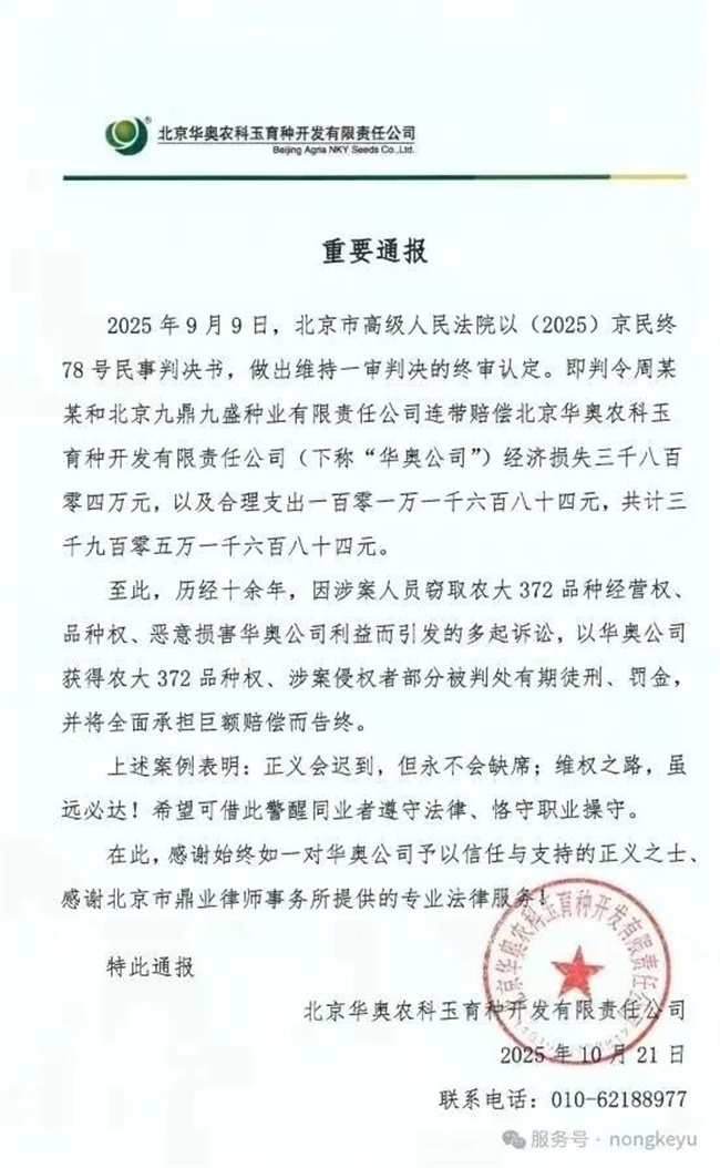 日前,北京華奧農科玉育種開發有限責任公司發布勝訴通報。據通報,2025年9月9日,北京市高級人民法院以(2025)京民終78號民事判決書,做出維持一審判決的終審認定。