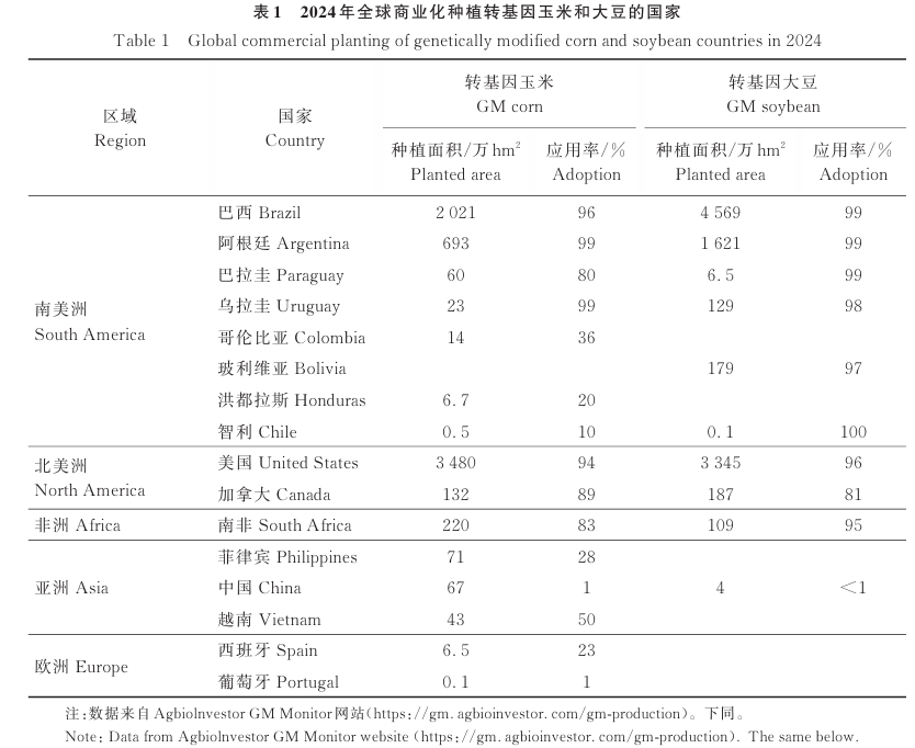 據Agbiolnvestor GM Monitor網站統計,2024年,美國、巴西和阿根廷是全球轉基因作物種植面積排名前三的國家,其轉基因玉米和大豆的種植面積均占本國玉米和大豆種植總面積的90%以上;在歐洲,包括法國、德國、波蘭、捷克共和國和羅馬尼亞在內的多個國家也曾小面積種植轉基因玉米。
