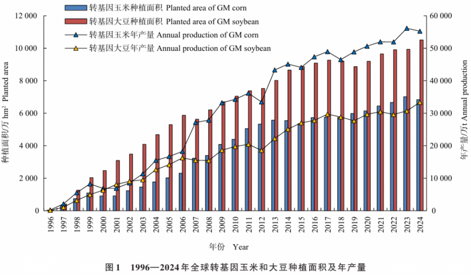 1996—2024年,全球轉基因玉米和大豆的種植面積及產量均呈現顯著的增長趨勢。