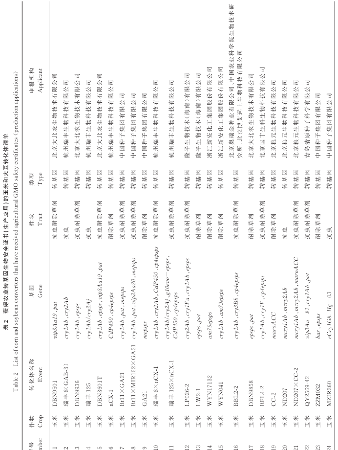 轉基因玉米品種的轉化體來源主要包括:"DBN9936""瑞豐125""ND207"Bt11×GA21""Bt11×MIR162×GA21""DBN3601T"目標性狀主要為抗蟲及耐除草劑,其中主要抗蟲類型有抗亞洲玉米螟、抗黏蟲及抗棉鈴蟲。轉基因大豆品種轉化體來源主要為"DBN9004"和"中黃6106",目標性狀為耐除草劑。