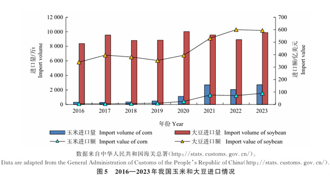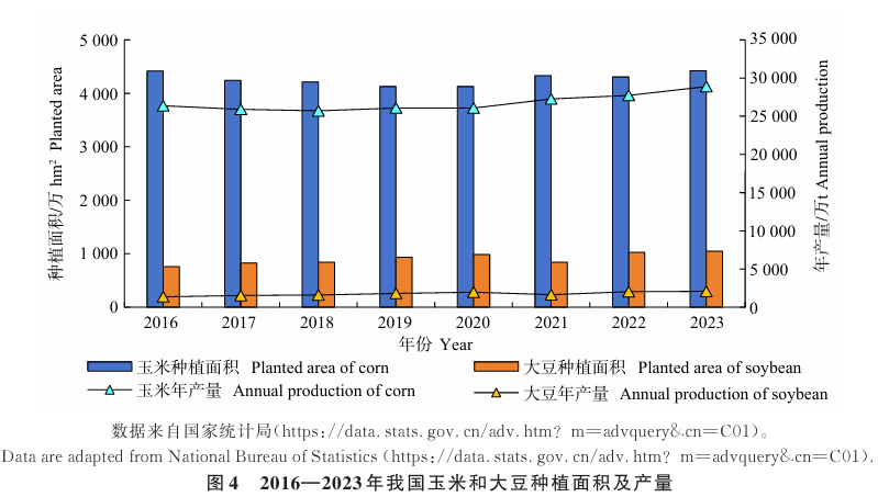 2023年,我國大豆的單產為1.99 t/hm²;2016—2023年,我國玉米的單產從5.97 t/hm²增長到6.53 t/hm²。