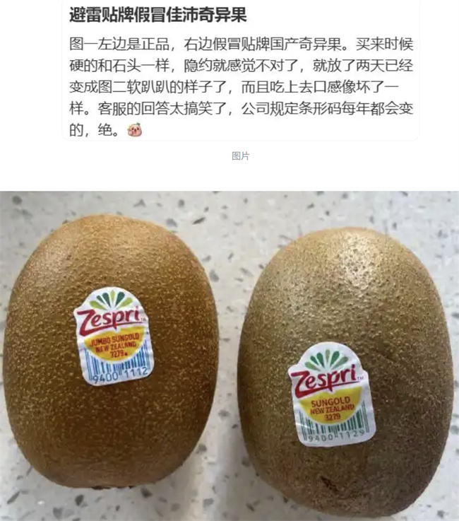 從那時起(qi),中國(guo)非(fei)法種植(zhi)的(de)陽光金果量(liang)不斷增(zeng)加,市面上的(de)假(jia)冒包裝也逐漸(jian)增(zeng)加。部分國(guo)內(nei)商(shang)家(jia)購買本地種植(zhi)的(de)獼(mi)猴(hou)桃,粘(zhan)貼假(jia)冒的(de)佳沛標(biao)簽(qian),冒充佳沛奇異(yi)果,在(zai)電商(shang)平(ping)臺進(jin)行(xing)違法銷售活(huo)動。