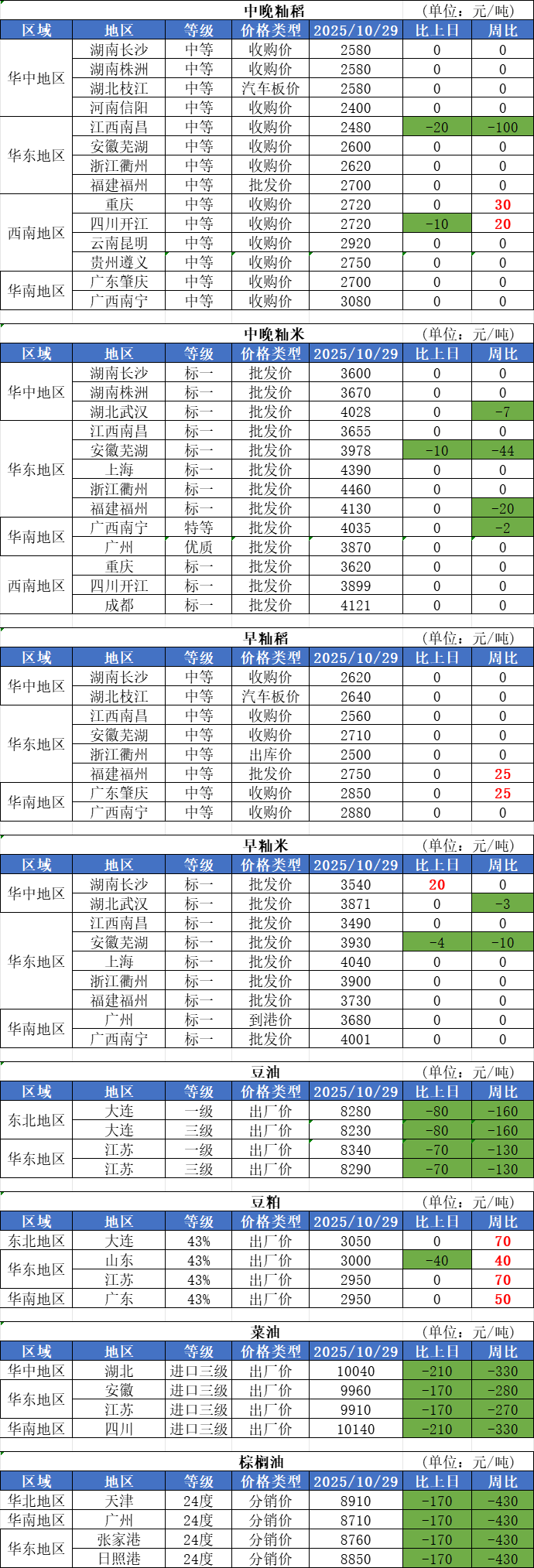3、截至10月25日,江西省累計收購中晚稻33.6億斤,同比減少0.2億斤。其中,國有企業累計收購5.8億斤,其他企業收購27.8億斤。常規中晚稻收購價格在129-135元/百斤之間,優質中晚稻價格在135-160元/百斤之間。