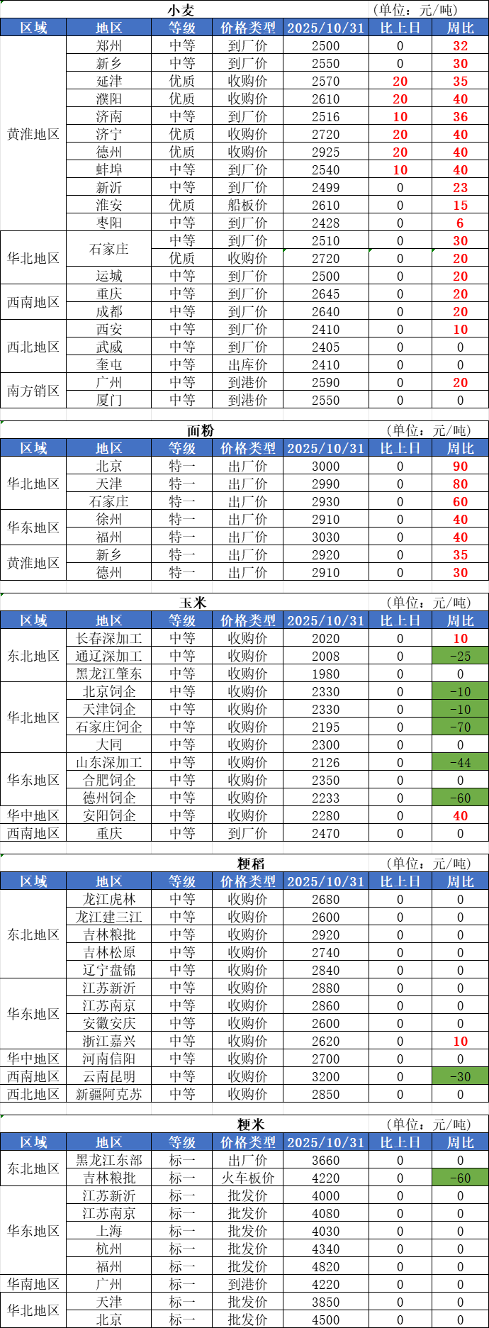 1、10月31日,全國小麥市場價格維持穩中上漲趨勢,漲價幅度5厘至1分。山東地區上漲范圍及漲幅均有所擴大,現階段,小麥價格高點維持1.29元/斤,市場看漲情緒濃厚,部分企業收購價格繼續追漲。