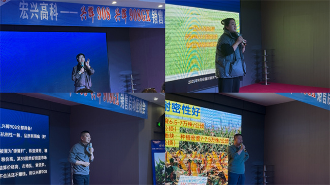 11月3日晚,備受矚目的興輝908/興輝908GX核心爆品銷售啟動會正式召開。宏興高科農業總經理徐建總經理為在場的經銷商朋友,種地大戶詳細解讀了興輝908/興輝908GX品種突出的優勢:抗逆性強、米質優、籽粒飽滿、高產兼穩產。通過經銷商的分享,以及大量的田間數據和對比分析,向與會者清晰地展示了其作為“核心爆品”的硬核實力。
