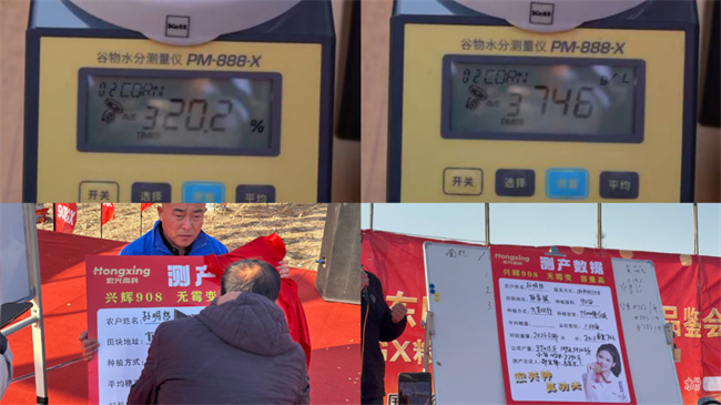 脫粒測產這是檢驗品種實力的終極考場。此次活動共有4方監測,來自德惠市農技推廣中心正高級農藝老師們,德惠市農業綜合執法大隊,現場的經銷商同仁以及種地大戶們,在300多人見證下,對收割、脫粒、稱重、測水分一系列流程進行監測,本次活動公開、公正、透明地進行。隨著測產專家報出最終實測產量,為實測水份20.2個水,當下容重為746克/升,實收公頃產量為37015斤,折合14個水份為34346斤。實收產量為2467斤/畝,標準干糧為2290斤/畝。