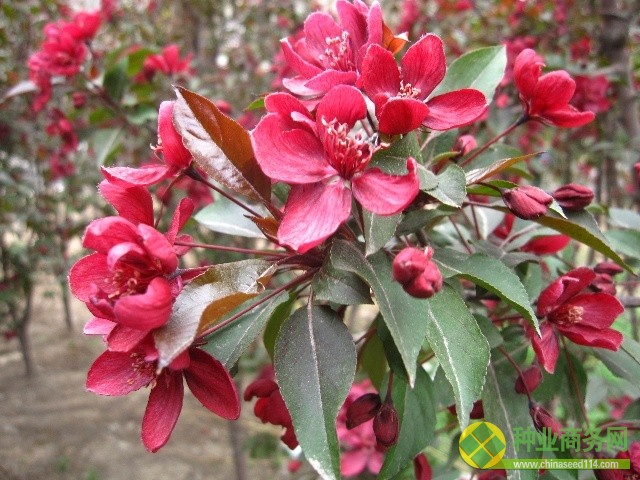 高原之火   喬木,高5~7m,樹型直立,樹冠圓呈開放型,冬季枝干呈暗紅色。春芽3月初萌發,深紫紅色,新生葉片亮酒紅色,成熟葉片逐漸變成帶有紫韻的橄欖綠。葉片長橢圓形,先端急尖,鋸齒鈍。花蕾深紅色,花深粉紅色,顏色艷麗,小花直徑3~3.5cm,非常醒目。6月底果實暗酒紅色,繁盛。果實直徑1.1cm,顏色由暗紅至橘紅,最后到深紅,秋冬季長時間掛在樹上。