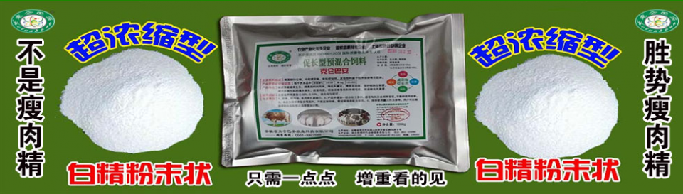 克侖巴安,只需一點點,增重看的見!千家萬戶的驗證:“多、快、好、省”即:吃的多,排的少、生長快、體型好、節省成本,縮短飼養周期。產品功效:使用3天后,采食量大增,7天后,糞便減少,臀部開始豐滿. 15天后,收腹,背部變寬. 20天左右,豬只各部位己達豐滿型. 使用期間料肉比可降低15%-18%,提高日增重20%-25%."克侖巴安"可以替代"瘦肉精"作用,無藥殘.料和尿任意檢測均成陰性.而且在大型豬場經過多次實驗,效果顯著、安全、營養、高效。現產品遠銷全國各地,深受養殖場歡迎。