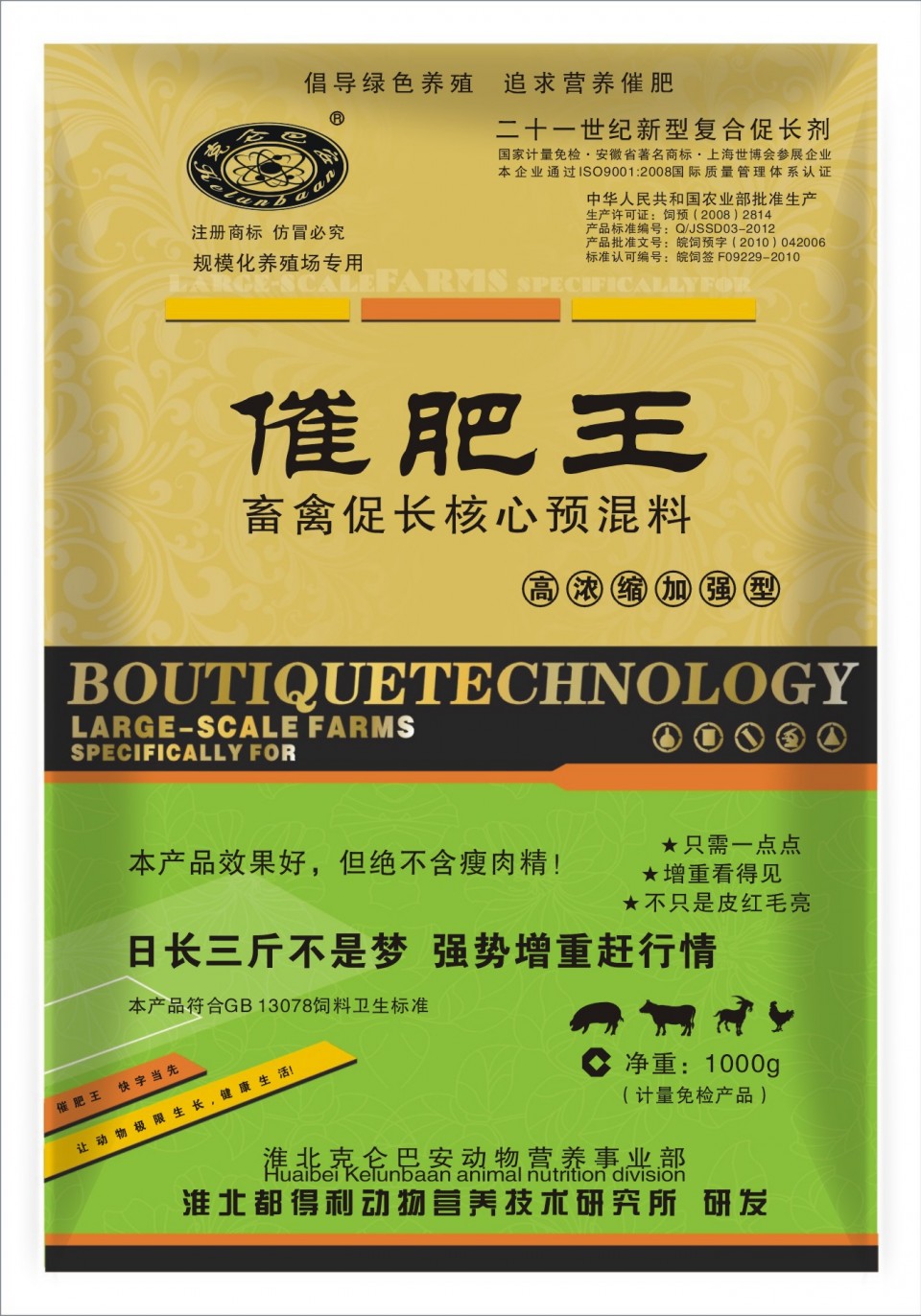 克侖巴安采用國外進口最新高科原粉國內分裝組合提高生長激素的基礎上著重協調營養物質的運轉和再分配,加速蛋白質的合成,達到提高肉豬的免疫力和抵抗力,迅速改良體形,促進生長速度,提高飼料能量的利用率的效果。從經濟效益來看,可明顯提高增重率和飼料報酬,同時因增加瘦肉率而使其食用價值和商品價值提高,因而增加養豬的效益。本品不含人畜共用的抗生素及國家違禁藥物,且其主要成分均為天然活性物質,因此尿檢無興奮劑陽性和假陽性,具有無殘留,無毒副作用的特點,是安全可靠、綠色環保的飼料添加劑。產品配方經數百次的實驗現已正式投放市場,在促進豬的生長速度,提高瘦肉率,改良體形,提高飼料報酬等方面取得重大突破。產品經廣東、上海、浙江、湖南、河南等一些大型豬場大面積使用經濟效益十分顯著。本品具有同瘦肉精和萊克多巴胺相同的作用和效果(經過大量試驗驗證檢測為陰性),提高飼料報酬和瘦肉率之功效,可以明顯提高豬的平均增重量.。化學結構穩定, 不會氧化,質量穩定,使用安全,無副作用,無藥物殘留。