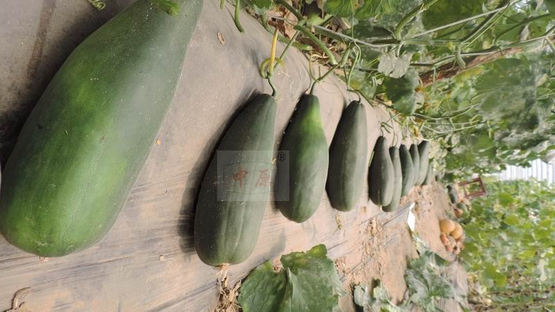 鄭州中原西甜研究所最新育成羊角蜜雜種。羊角蜜是農家常規品種,瓜農習慣自己留種,因此種性嚴重退化,不抗病,糖度低、瓜小產量低,瓜形皮色不一致。真對上述原因利用現代育種手段選育代替品種顯得及其重要。我們首先對羊角蜜進行多代提純復壯,選取優良單株作母本雜交。后代觀察5※11比較復合育種目標,雜交優勢明顯。經2013年冬季云南耿馬試驗和2014年春昌樂,河南中牟大棚試種,周口扶溝大李莊鄉露地試驗結果表現:早熟性與羊蜜相當,高溫季節栽培花后25天采收。雌花早生,而密。第一雌花著生在子蔓第一片葉液間,以后一片葉一個雌花。子蔓、孫蔓均可結瓜,連續結瓜性強,單株結4~9個。果形長棒錘形,縱徑26cm,橫徑8cm,肉厚2cm。皮色墨綠,肉綠色,瓜瓤桔紅色。肉厚種腔小。熟瓜香酥脆甜多汁,適口性極佳,科學含糖度15%。單瓜重1-2kg,畝產5000kg左右。產量與羊角蜜比較提高20%。抗病性超越羊角蜜,田間觀察對照白粉病、角斑病、霜霉病發病率降低。抗逆性強適應廣。適宜各甜瓜產區各種栽培模式種植。露地栽培對整枝打杈要求不嚴格,管理粗放,很適合大面積懶漢種植。雜交后代外觀形狀與羊角蜜區別較大,所以新命名:中原口福香瓜