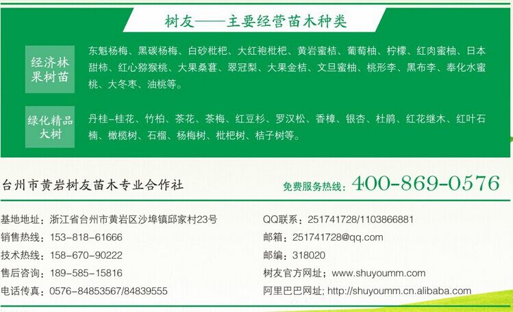 臺州市黃巖樹友苗木專業合作社,理事長:牟王斌的帶領下本社得到浙江省農科院、農大、農業廳、林業廳專家的幫助親臨指導,通過精選提高質量,培育了一批又一批的優質果樹苗木,綠化-花卉 苗木,不僅為我省提供優良苗木,還為我國的南方各省、市部分地區提供了優良的苗木。銷售往福建、江西、廣東、廣西、湖南、貴州、云南等各地。凡是購我們苗木的客戶沒有一個提出不掛果、不正宗、不受益等意見。現在本社在中國臺州市林業研究所重視支持下,再給西部人發提供優良品種,大幅度提高果樹,綠化-花卉 苗木效益,給西部人發走向致富,我們仍堅持不懈,本著品種純正、質量保證、踴躍服務的宗旨。目前我社是國內較強楊梅苗/丹桂-桂花苗示范生產基地。規格齊,質量優,價格實,深受新老客戶的好評,歡迎各位朋友及各經銷商前來選購和合作經營。