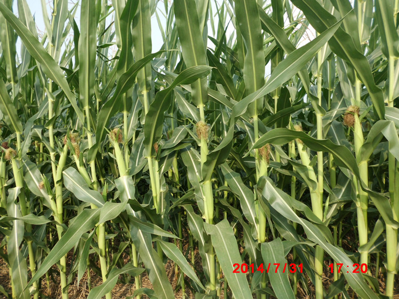 該(gai)品種(zhong)全(quan)生育期88天,比對照先(xian)玉335早(zao)熟10天;葉片窄而上沖,株型緊湊(cou),株高245cm,穗(sui)(sui)位(wei)90cm,成株葉片數(shu)19片,秸稈堅硬,高抗(kang)倒伏。果穗(sui)(sui)筒形,穗(sui)(sui)長17-19cm,穗(sui)(sui)行(xing)數(shu)14-16行(xing),行(xing)粒(li)數(shu)38;穗(sui)(sui)軸紅色,籽粒(li)黃色,馬齒(chi)型,出籽率91.2%,千粒(li)重405g,容重805克/升(sheng)。