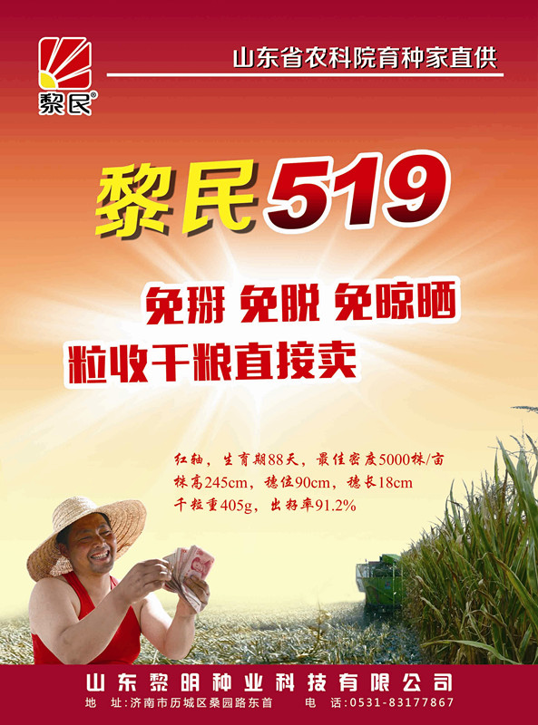黎民519,是山東黎明種業科技有限公司選育的玉米雜交種。法國資源,歐洲頂配,具有熟期早、脫水快、耐密植、高產穩產、抗倒伏、適應性廣、株型清秀、適宜籽粒收獲等優點。黎民519真正做到了“免掰、免脫、免晾曬、粒收干糧直接賣” 是引領中國玉米種業籽粒直收的劃時代良種。