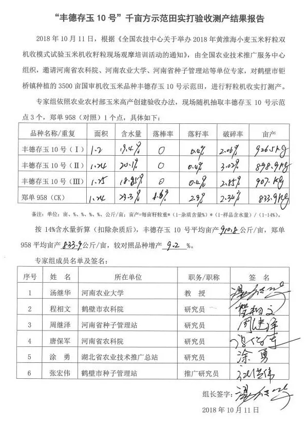 隨后,河南農業大學湯繼華教授宣布:專家組依照農業農村部玉米高產創建驗收辦法,豐德存玉10號平均畝產910.8公斤,創造黃淮海地區籽粒機收高產記錄。