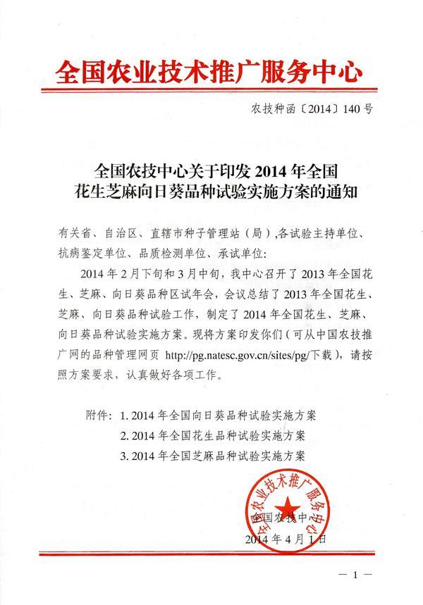 2014年國家花生芝麻向日葵品種試驗實施方案