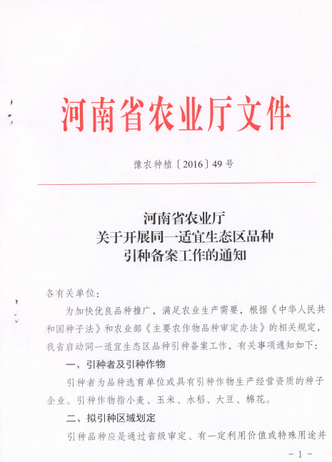 1.河南省同一適宜生態區品種引種備案申請表(參見豫農種植〔2016〕49號文件);