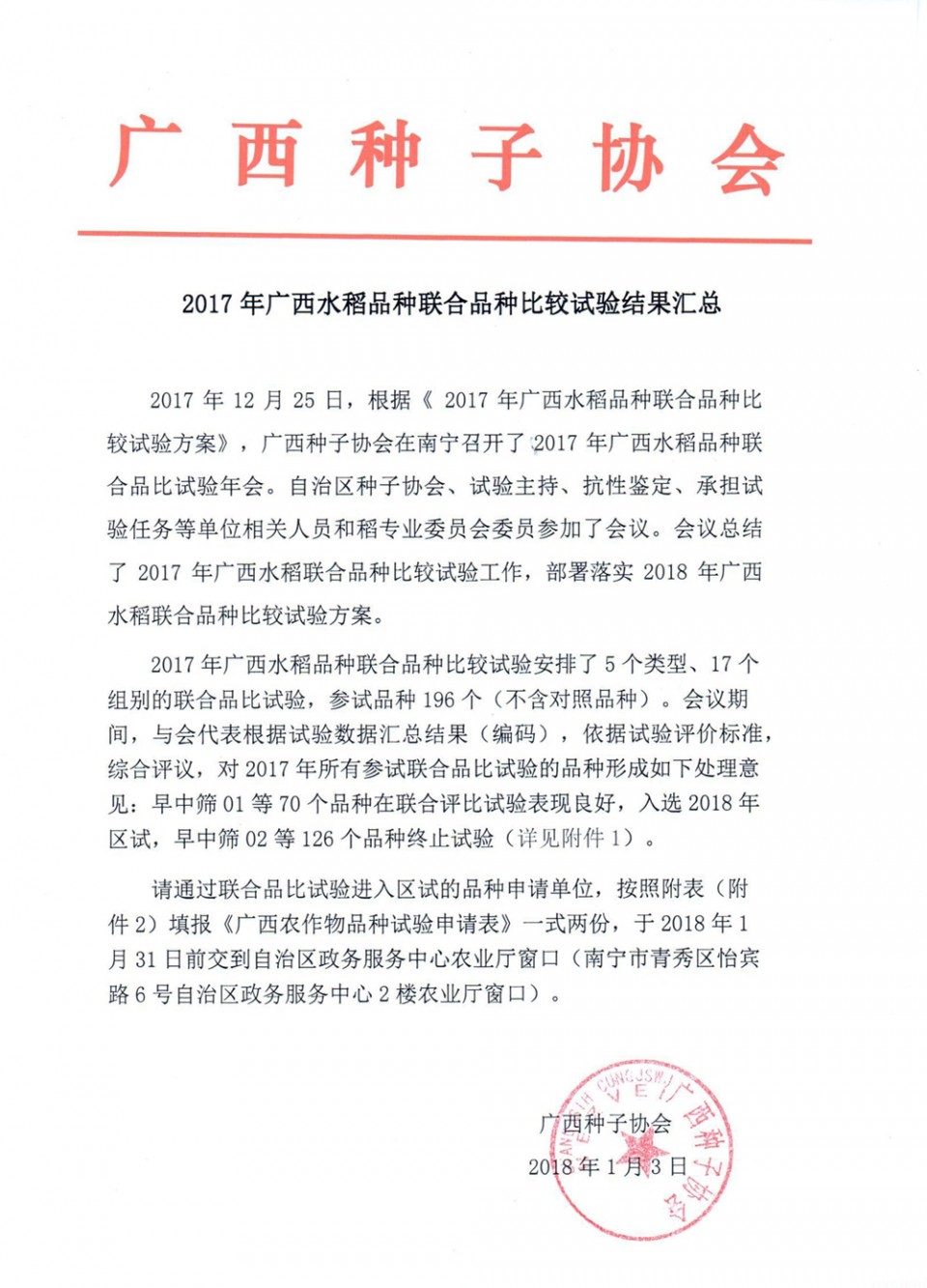 2017年廣西水稻品種聯合品種比較試驗結果匯總