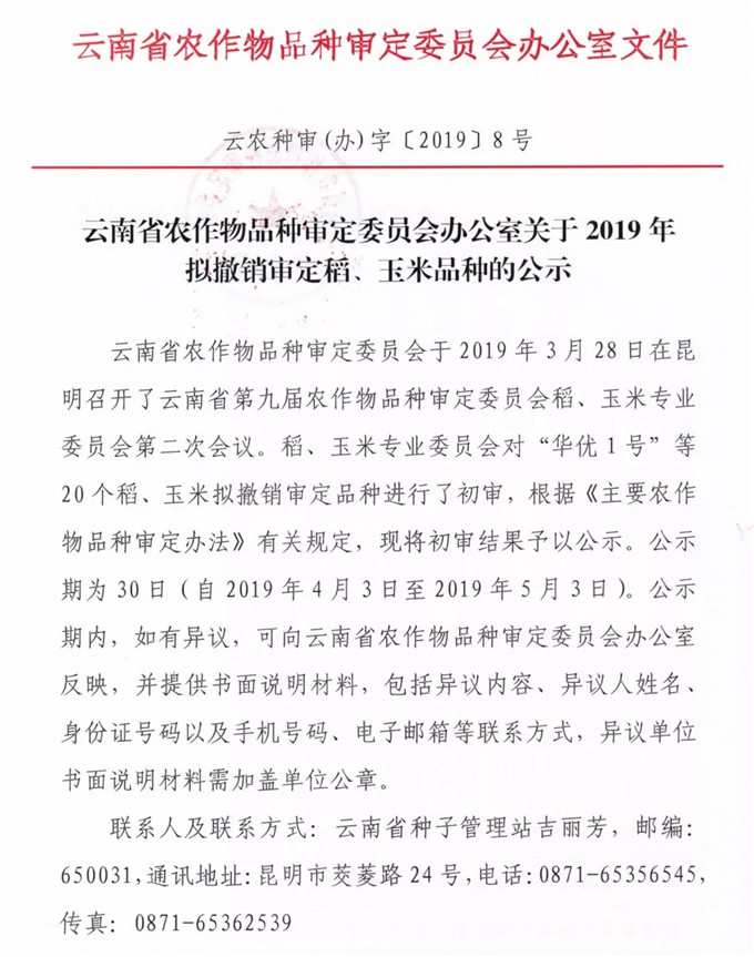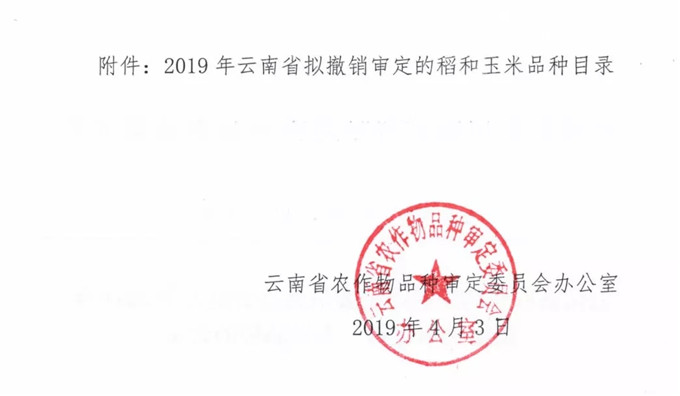 2019年云南省擬撤銷審定的稻和玉米品種目錄