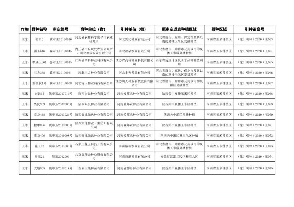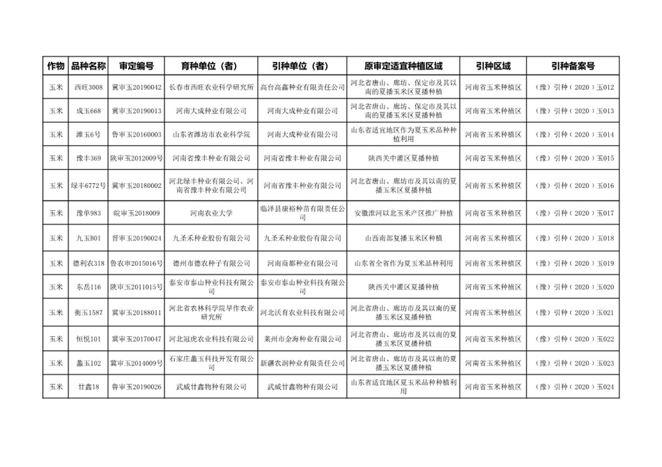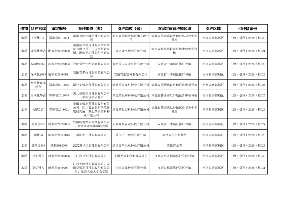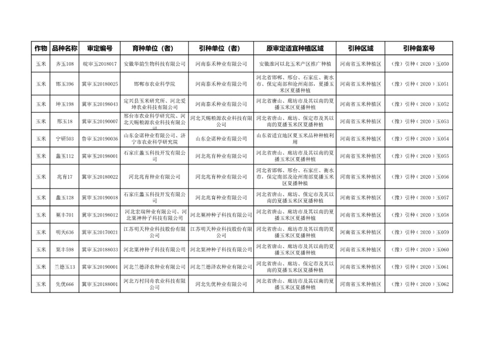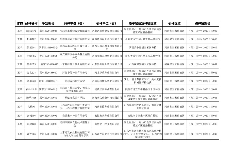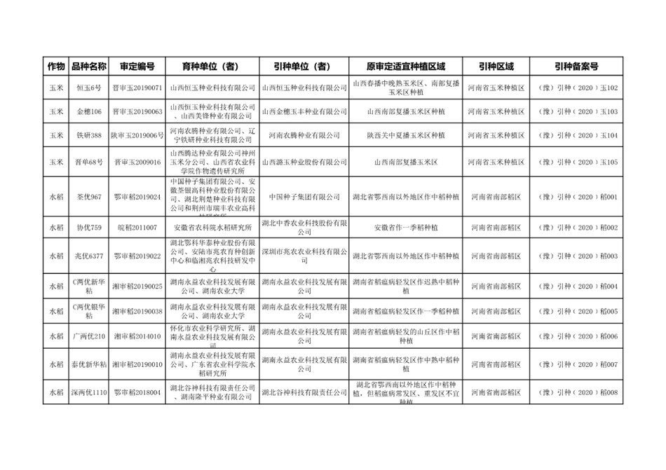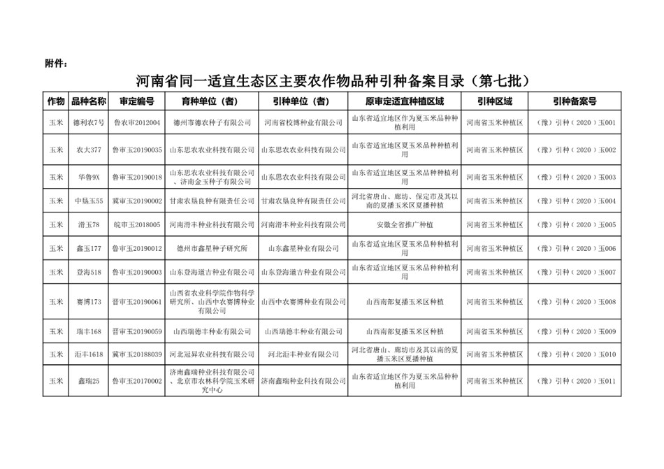 河南省同一適宜生態區主要農作物品種引種備案目錄(第七批)