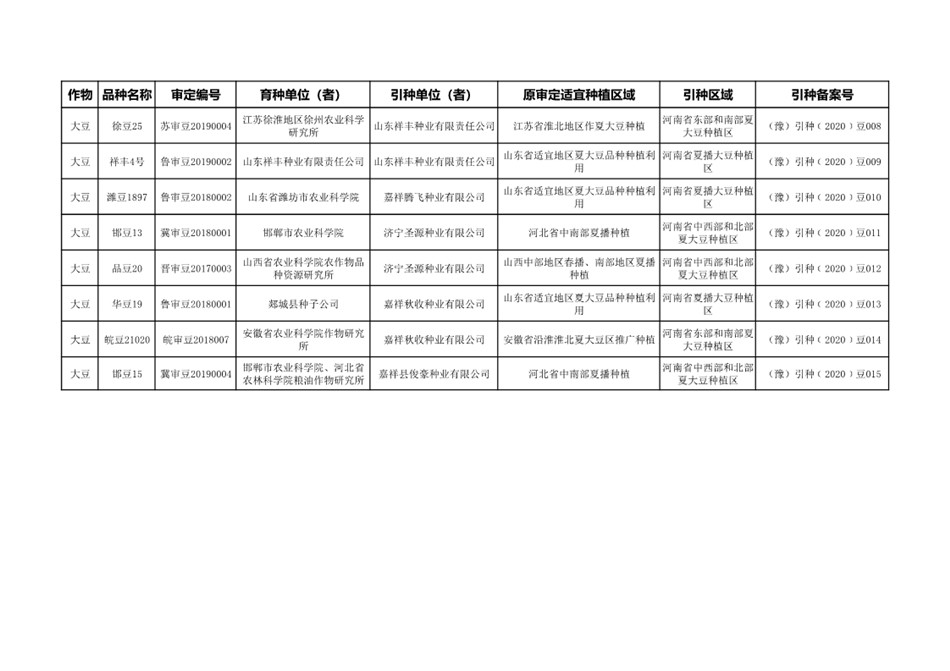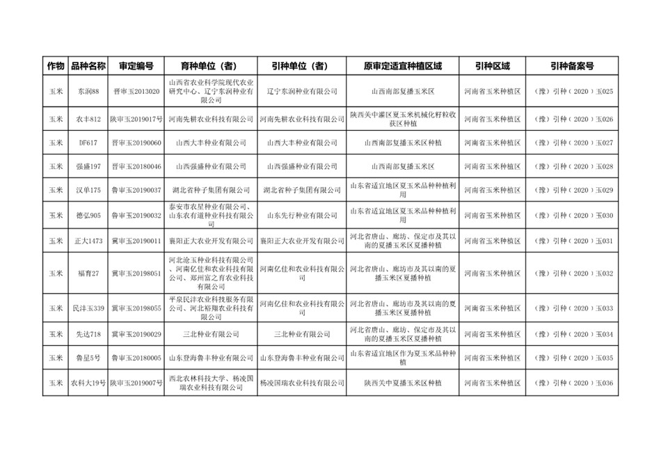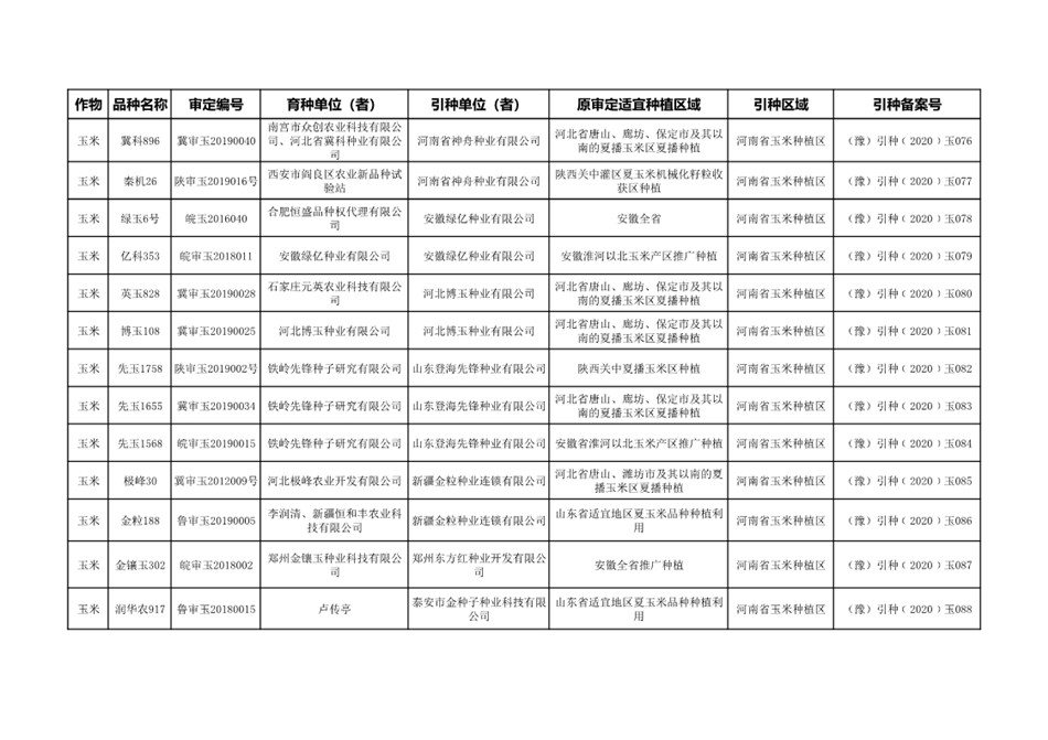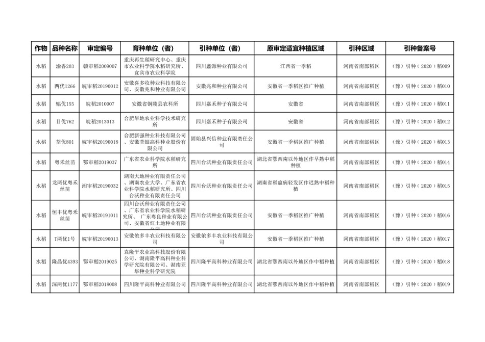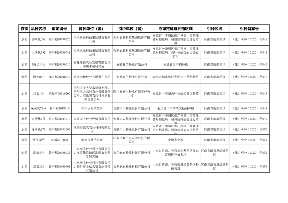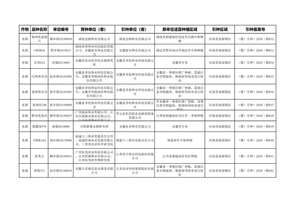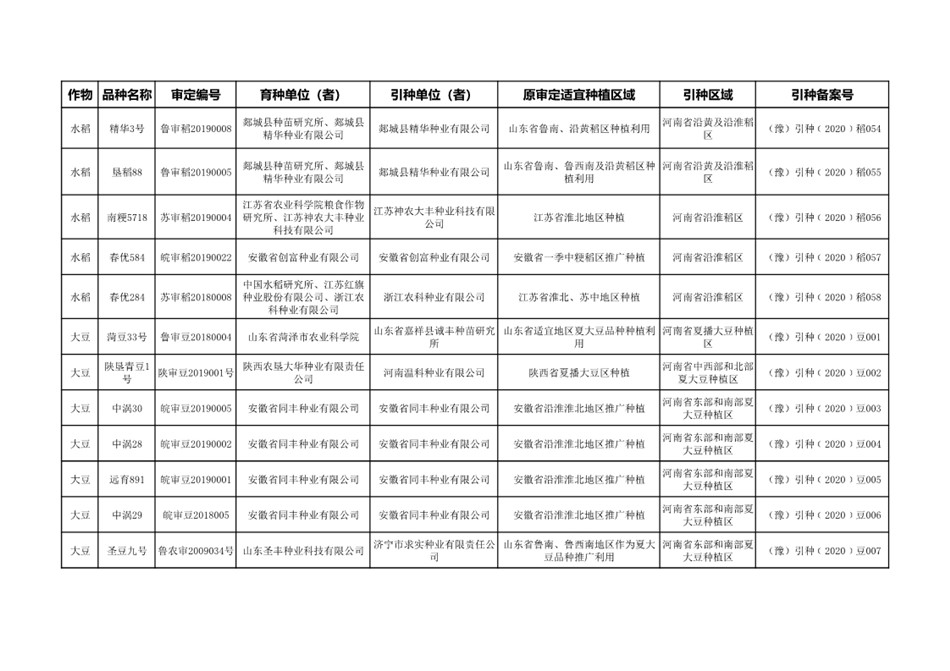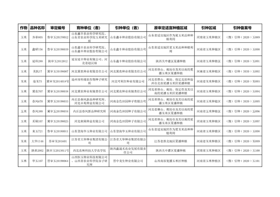 河南省同一適宜生態區主要農作物品種引種備案目錄(第七批)