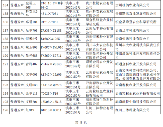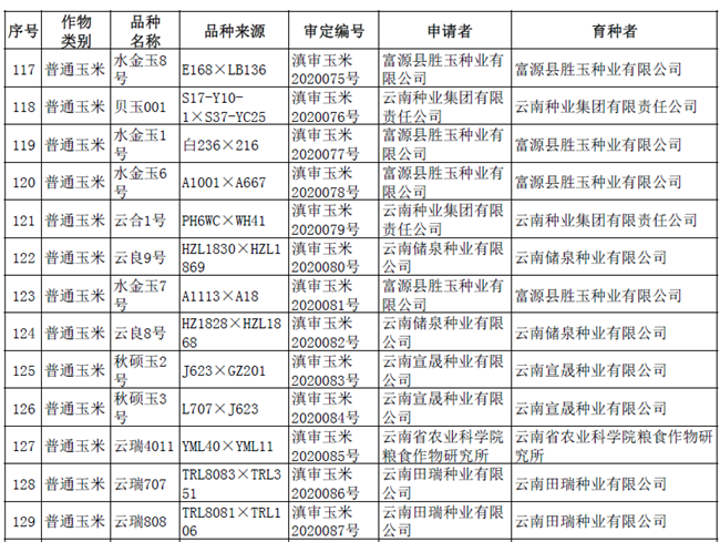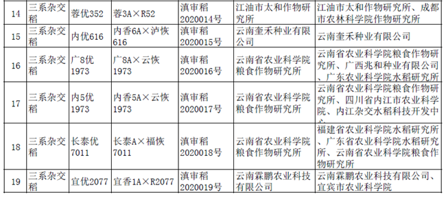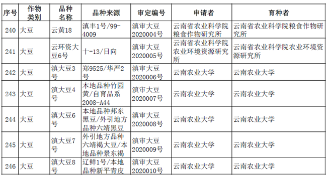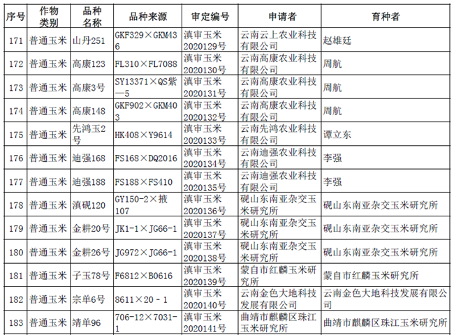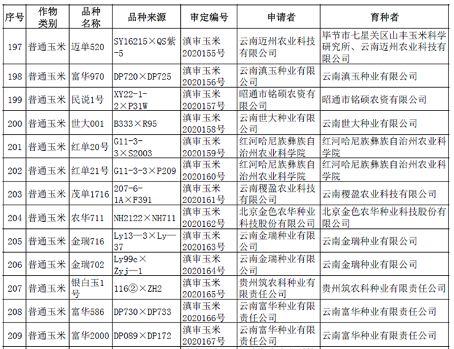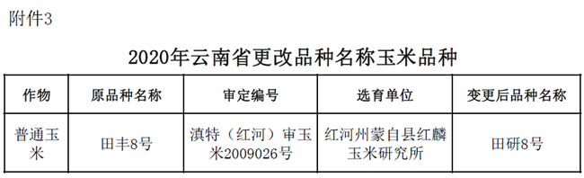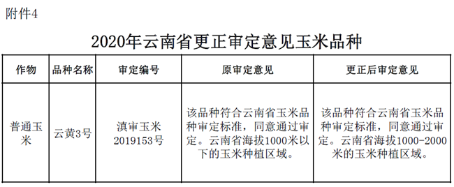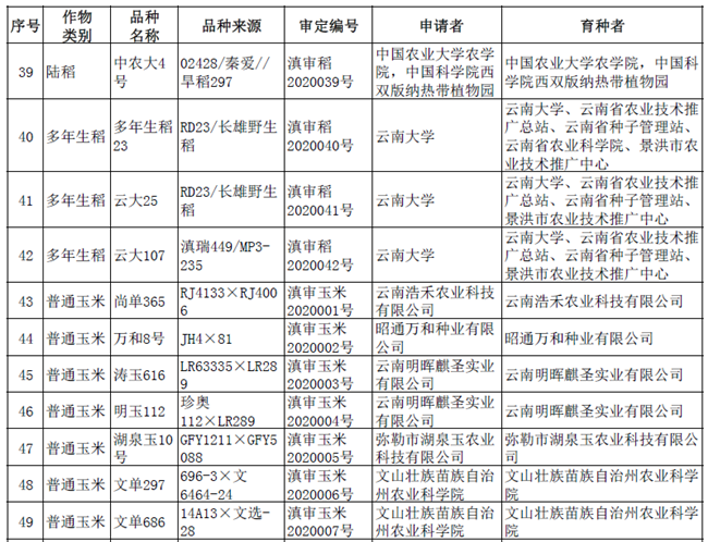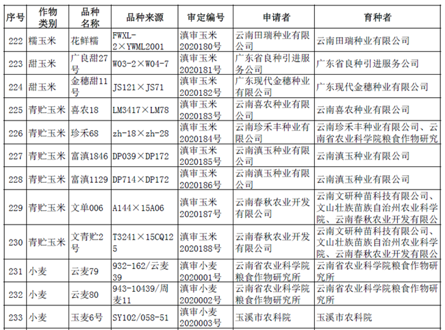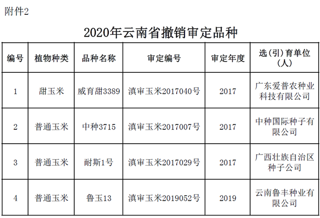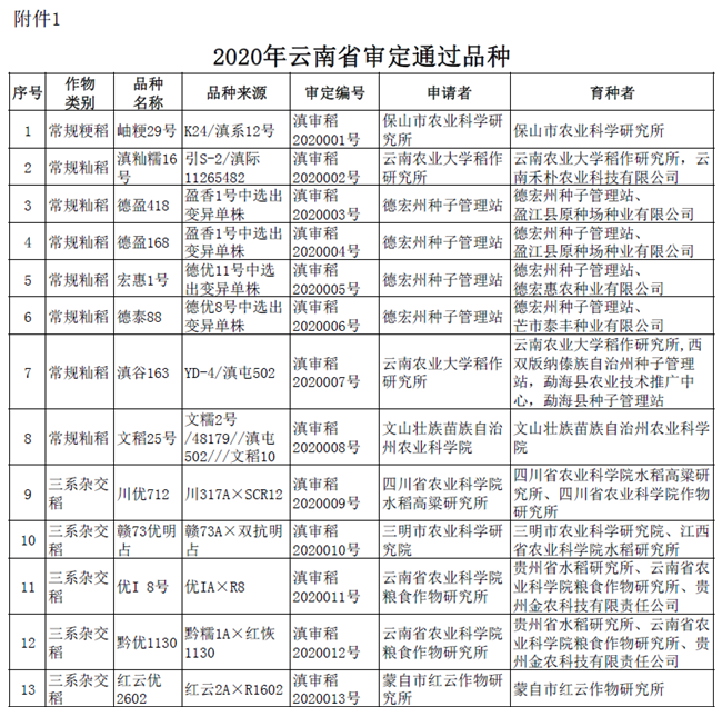 根據《中華人民共和國種子法》和農業農村部《主要農作物品種審定辦法》的規定,云南省農作物品種審定委員會于2020年7月31日在昆明召開了云南省第九屆農作物品種審定委員會主任委員會第五次會議,審定通過了稻、玉米、大豆、小麥作物新品種246個(附件1,附件5);撤銷審定玉米品種4個(附件2);更改品種名稱玉米品種1個(附件3);更正審定意見玉米品種1個(附件4)。