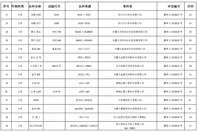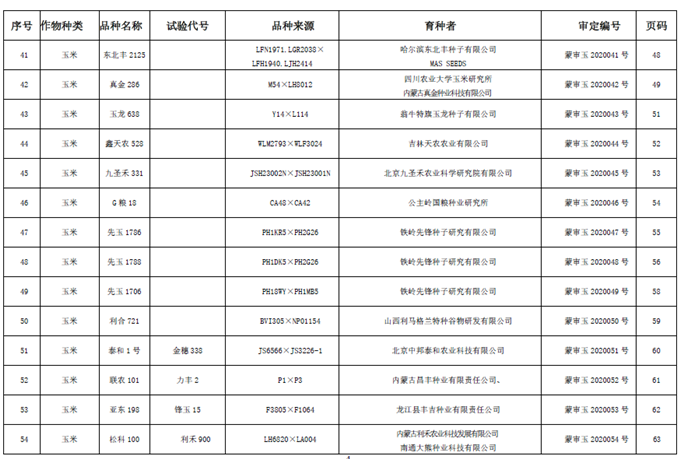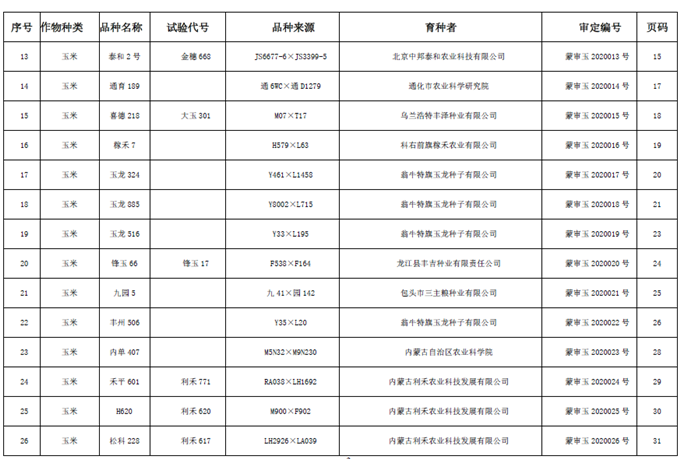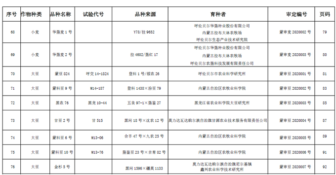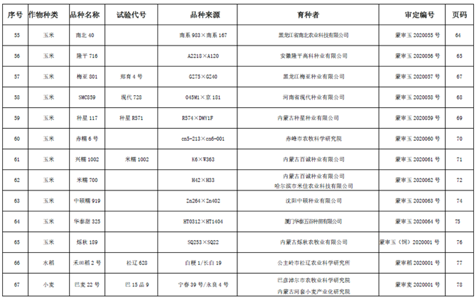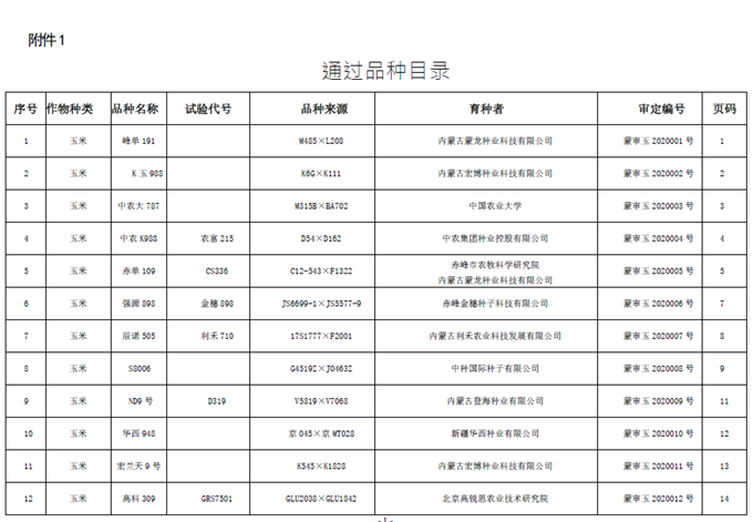 內蒙古自治區農牧廳2020年農作物品種審定公告