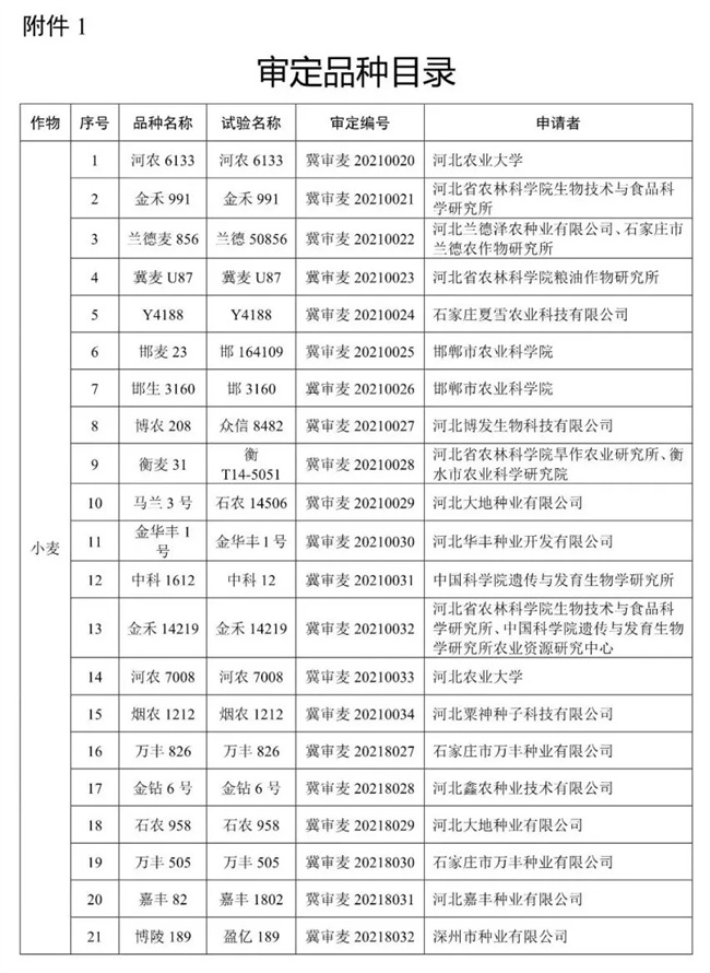 河北省農作物品種審定委員會于2021年10月召開了第五十七次品種審定會議,審定通過了44個小麥品種,審議通過了第五十六次品種審定會議審定的玉米品種民灃玉1818名稱變更。以上審議結果已報農業農村部公示無異議,現予公告。