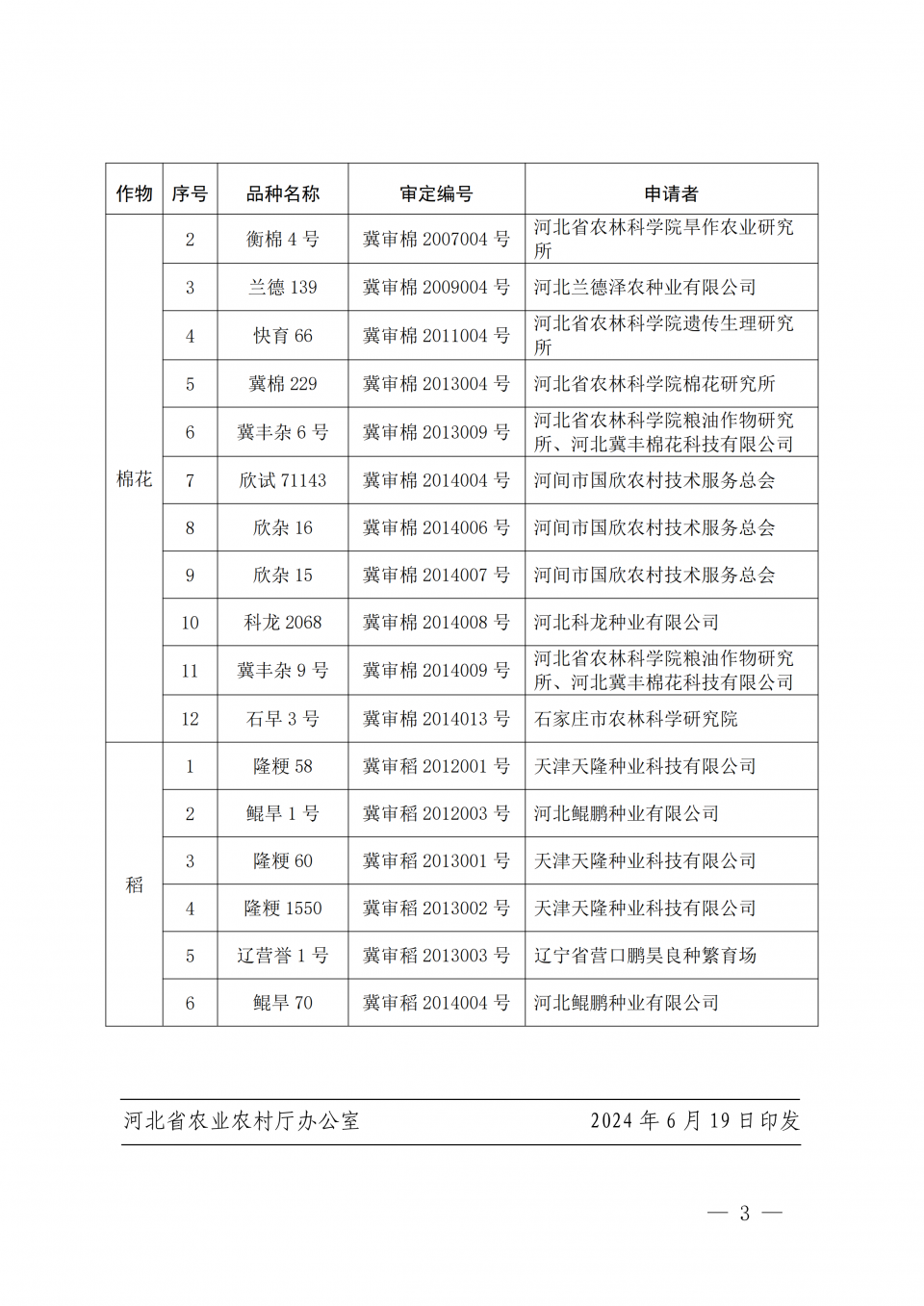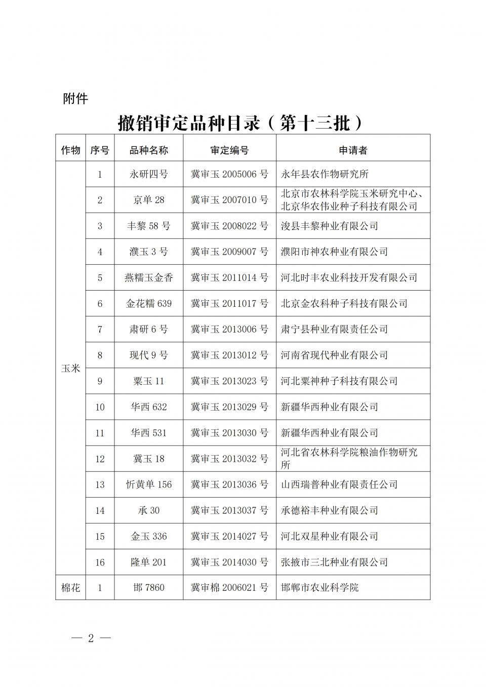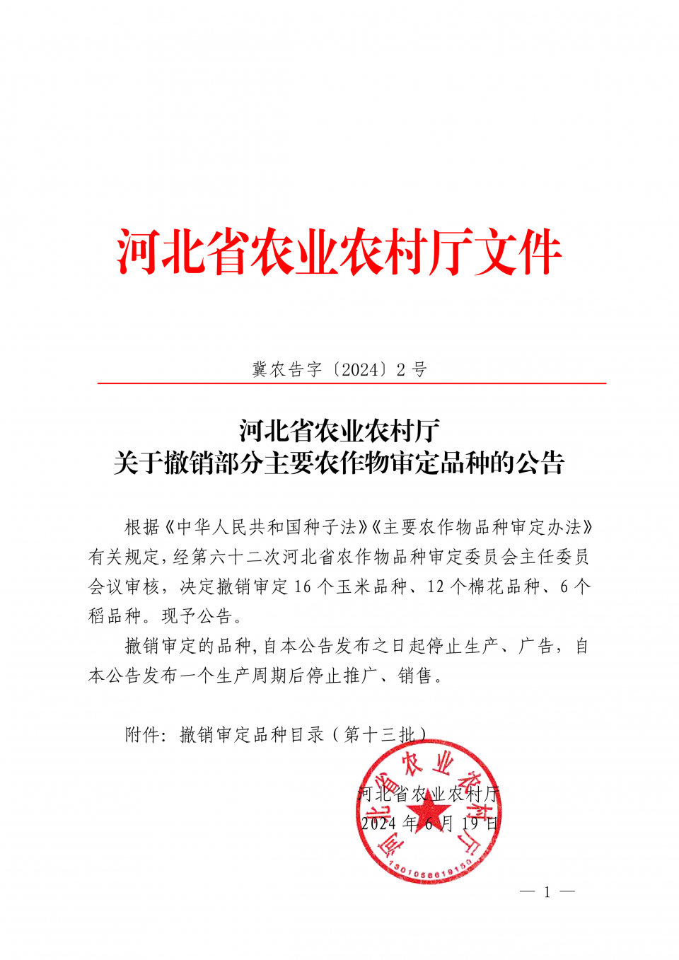 根據《中華人民共和國種子法》《主要農作物品種審定辦法》有關規定,經第六十二次河北省農作物品種審定委員會主任委員會議審核,決定撤銷審定16個玉米品種、12個棉花品種、6個稻品種。現予公告。