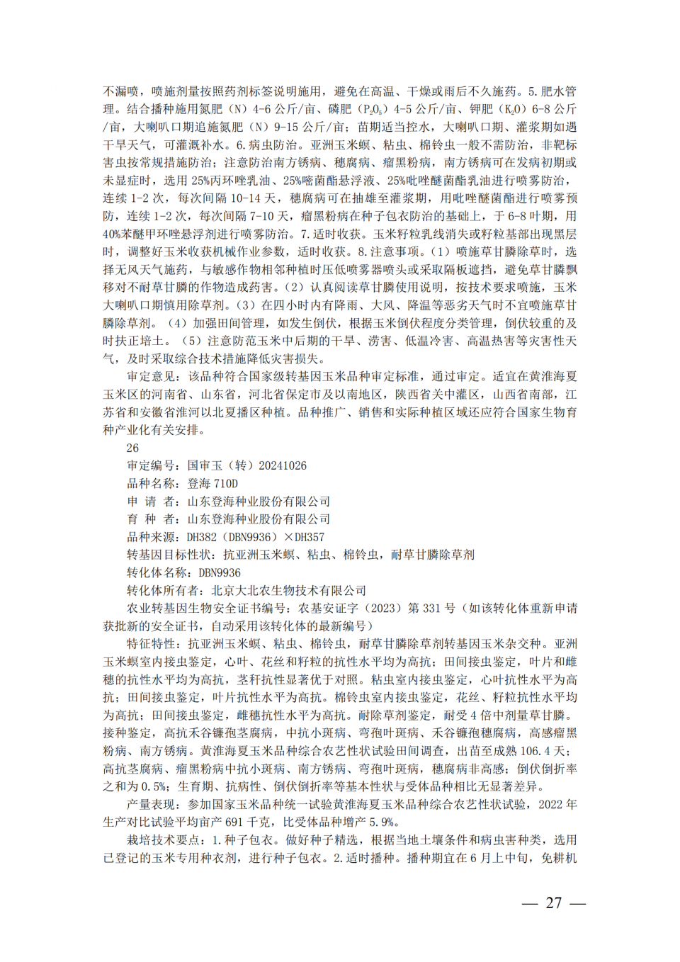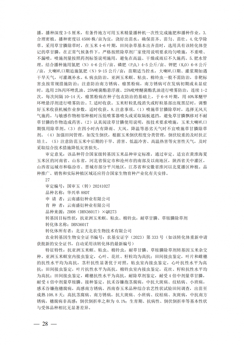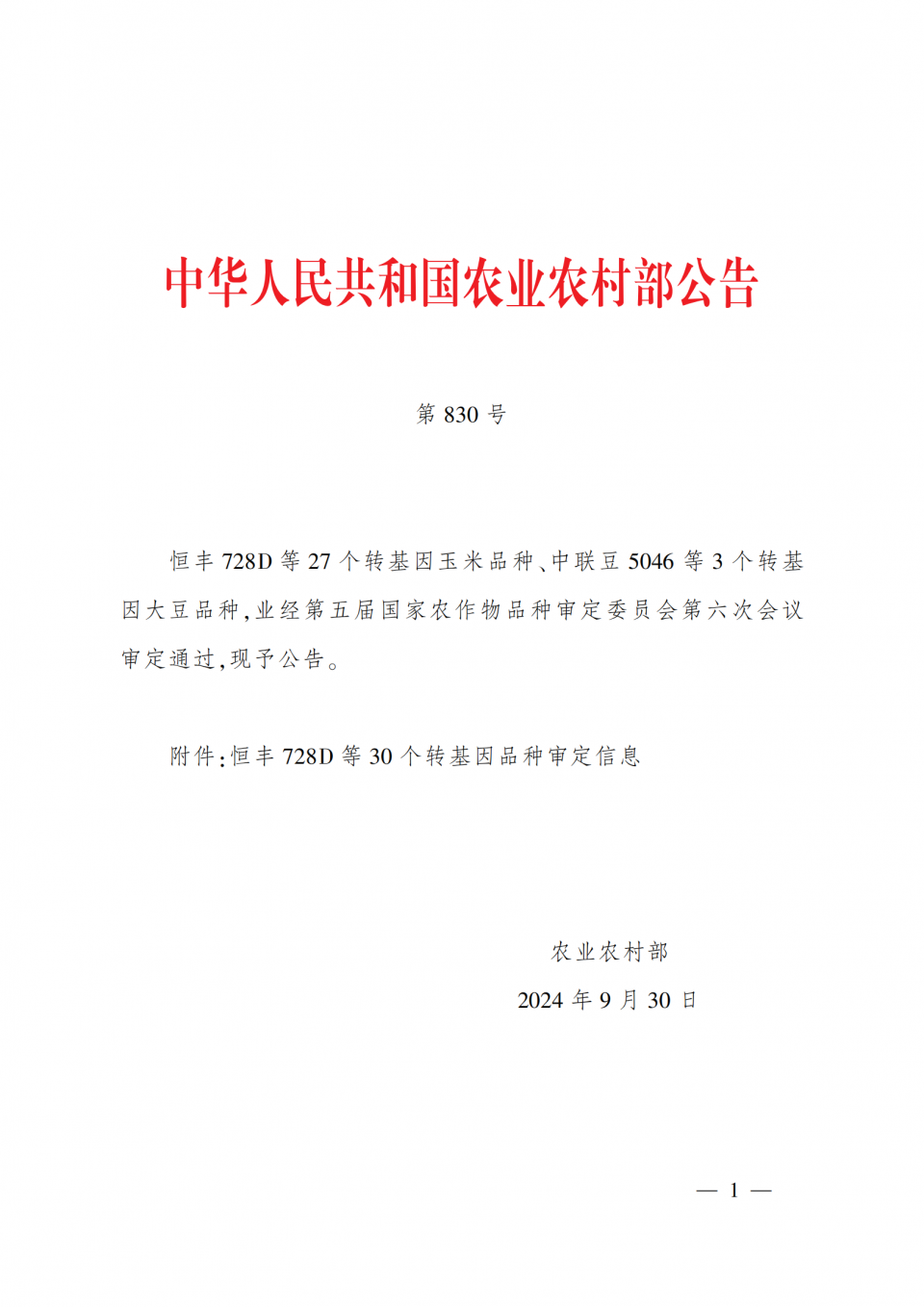 恒豐728D等27個轉基因玉米品種、中聯豆5046等3個轉基因大豆品種,業經第五屆國家農作物品種審定委員會第六次會議審定通過,現予公告。