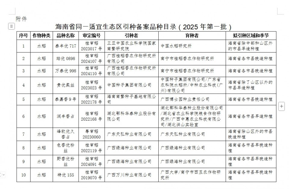 附件:海南省同一適宜生態區引種備案品種目錄(2025年第一批)