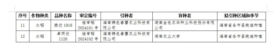 根據《中華人民共和國種子法》《主要農作物品種審定辦法》《海南省農業廳關于開展同一適宜生態區主要農作物審定品種引種備案工作的通知》(瓊農字〔2017〕79號)等相關規定,經初審,泰豐優717、珀優0898、萬泰優998、貴優柔絲、泰嘉香9號、潤豐香占、峰軟優久香占、色香優粉絲、野香優粉絲、特優155、振優1918、卓兩優1126等12個水稻品種符合主要農作物同一適宜生態區引種備案條件,現予公示,公示期為2025年6月11日至2025年6月17日。公示期內如有異議,可向海南省農作物品種審定委員會辦公室書面反饋,同時提供辦公電話、手機號碼、電子郵件等聯系方式,并由異議人本人簽字或加蓋異議單位公章。