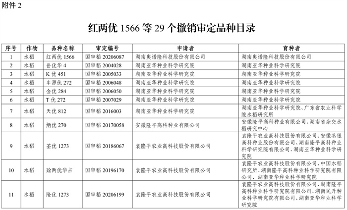 2. 紅兩優1566等29個撤銷審定品種目錄